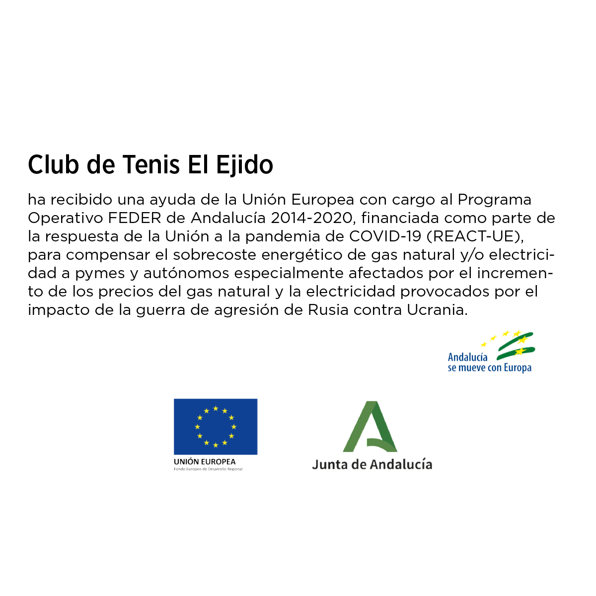 El Club de Tenis El Ejido ha recibido una ayuda de la Unión Europea con cargo al Programa